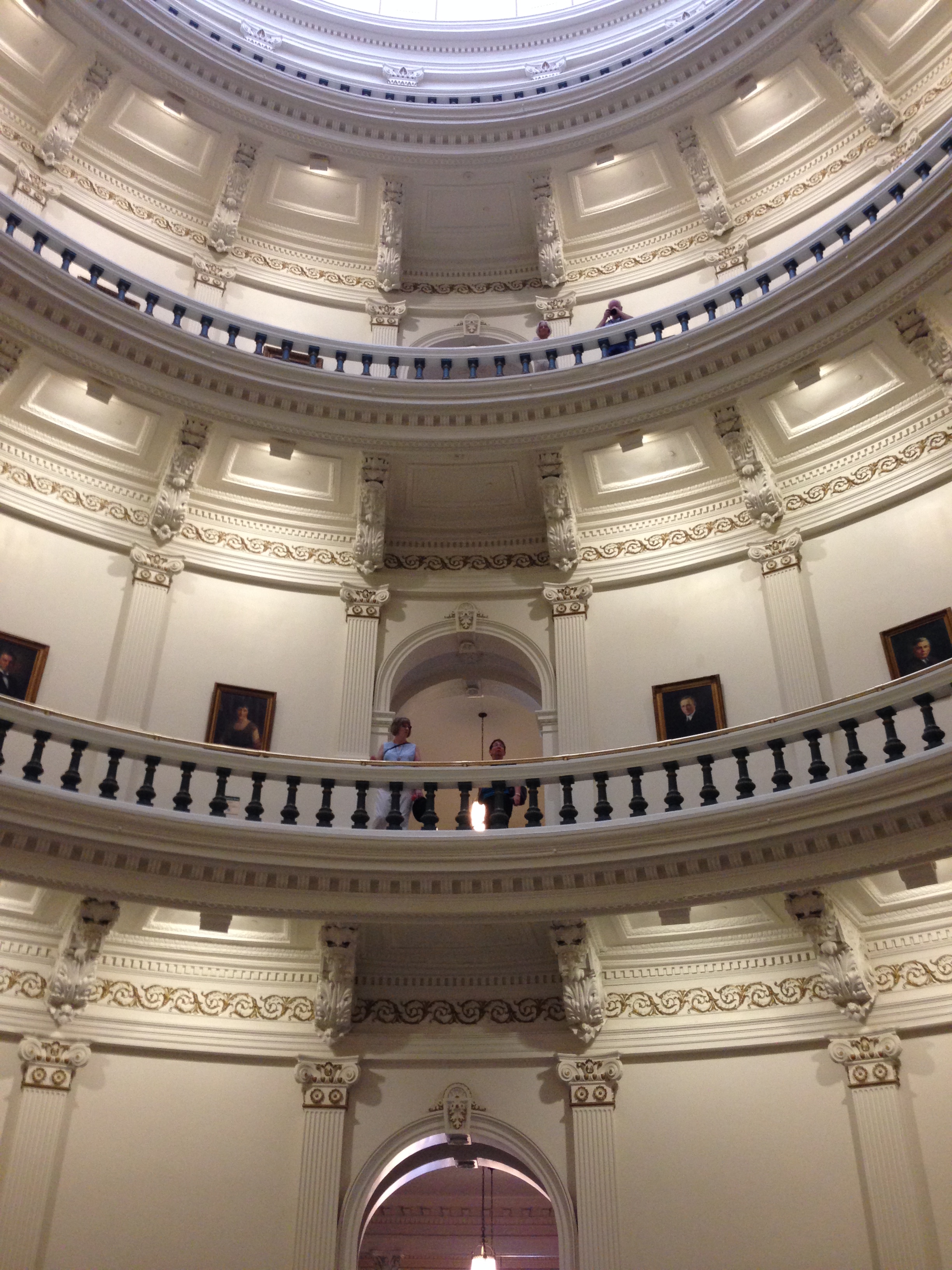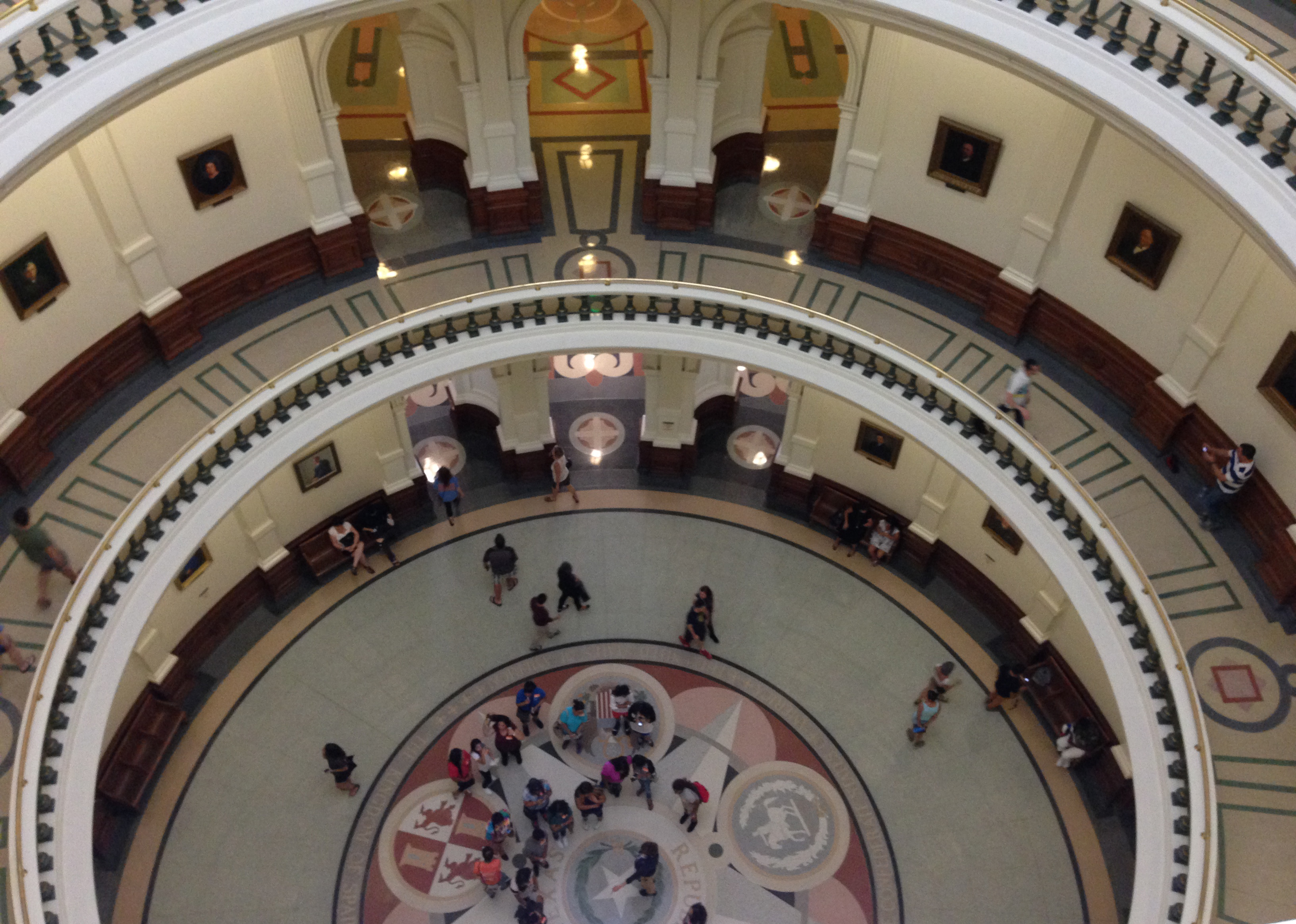 On the floor under the d0me are seals of the nations whose flags have flown over Texas. It is 218 feet from the floor to the top of the dome. I felt like I was going to fall over the rail taking this picture.