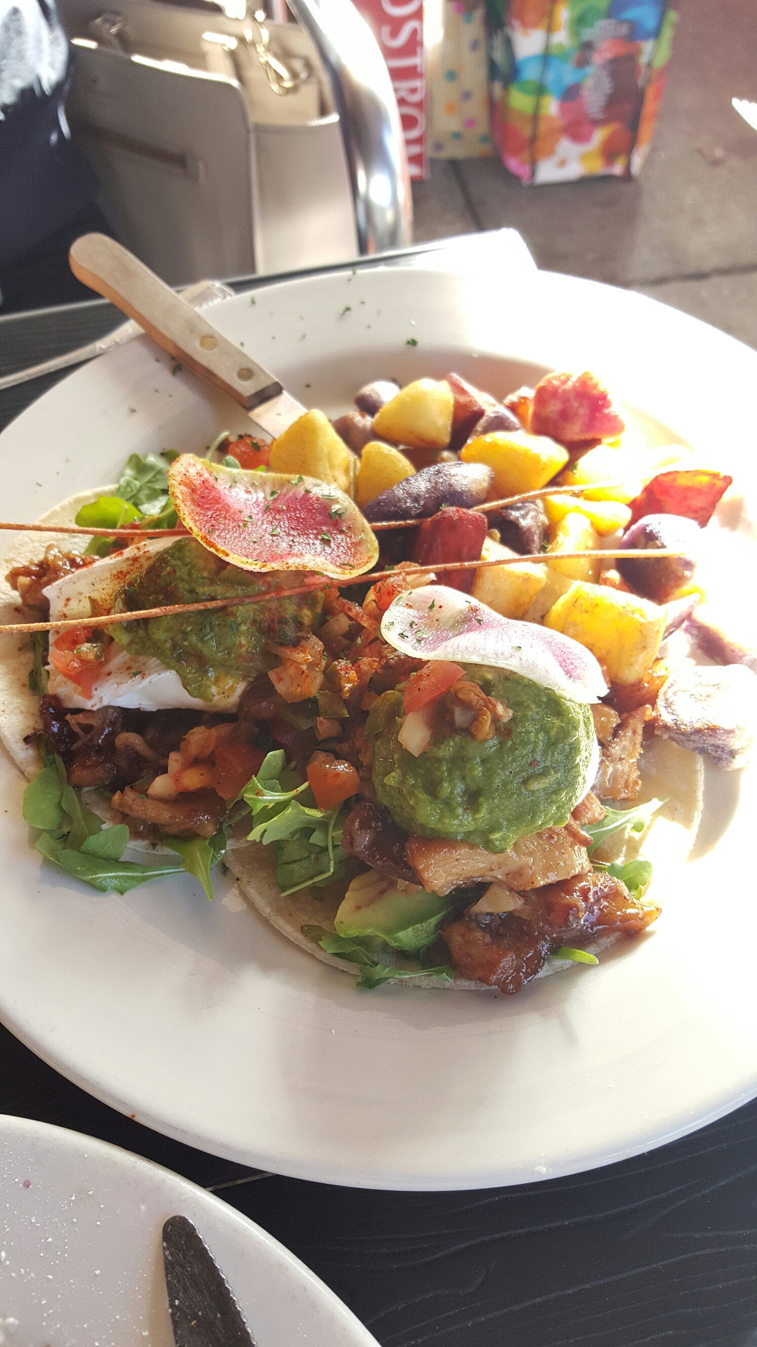 The belly rancheros with slow cooked Kurobata pork belly, avocado, arugula, and Kimchi pico de gallo over corn tortillas were amazing! The Kimich pico de gallo was more like a green sauce than a pico de gallo, but the flavor burst put this dish over the top. Everything coated with this sauce tasted delicious and helped balance the sweetness of the pork belly. Dreaming of the sauce now!