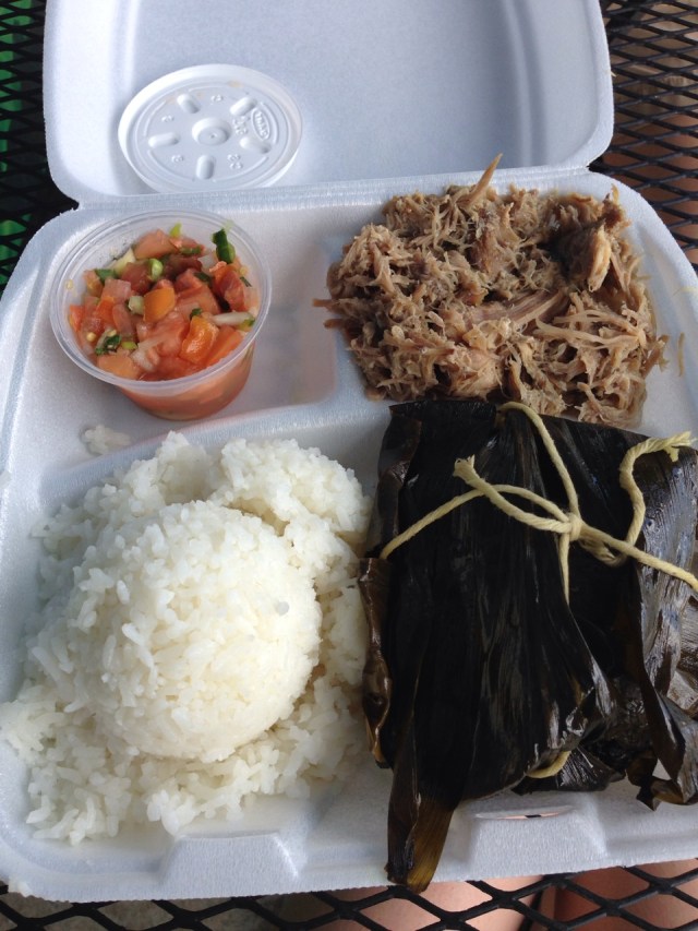 Above is order #7 which comes with kalua pork, laulau, lomi lomi salmon, and rice. Kalua in Hawaiian means to cook in an underground oven (imu). The imu is created by digging a deep pit, lining it with hot rocks and a layer of veggies. Then te pig is placed on top of veggies, covered with a wet burlack sack, and another layer of hot rocks. After hours of smoking, the pig comes out super tender and smoky.